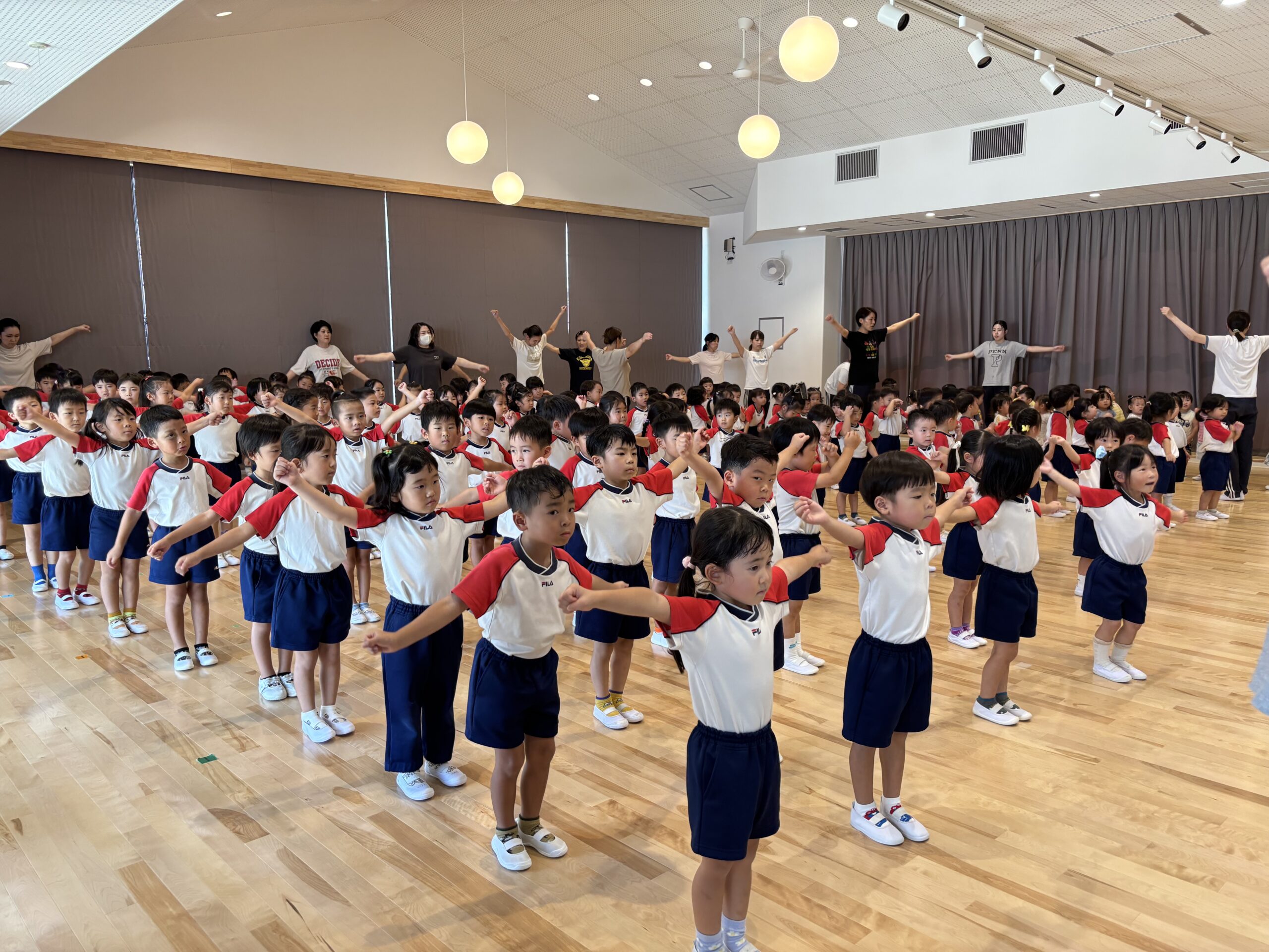 9月に入ったというのに酷暑が続いていますね。暑い時期はお遊戯室でラジオ体操をしています。うめ組さんのお当番さんが二人出て前で体操をしてくれます。毎日交代で先生たちの朝のお話を聞くのも日課です。今週金曜日、ゆり組うめ組は、旭町のだんじり小屋で写真を撮ったり屋根に乗せてもらったりします。小屋から会館まで曳かせてもらえるのも楽しみにしています!