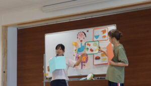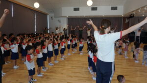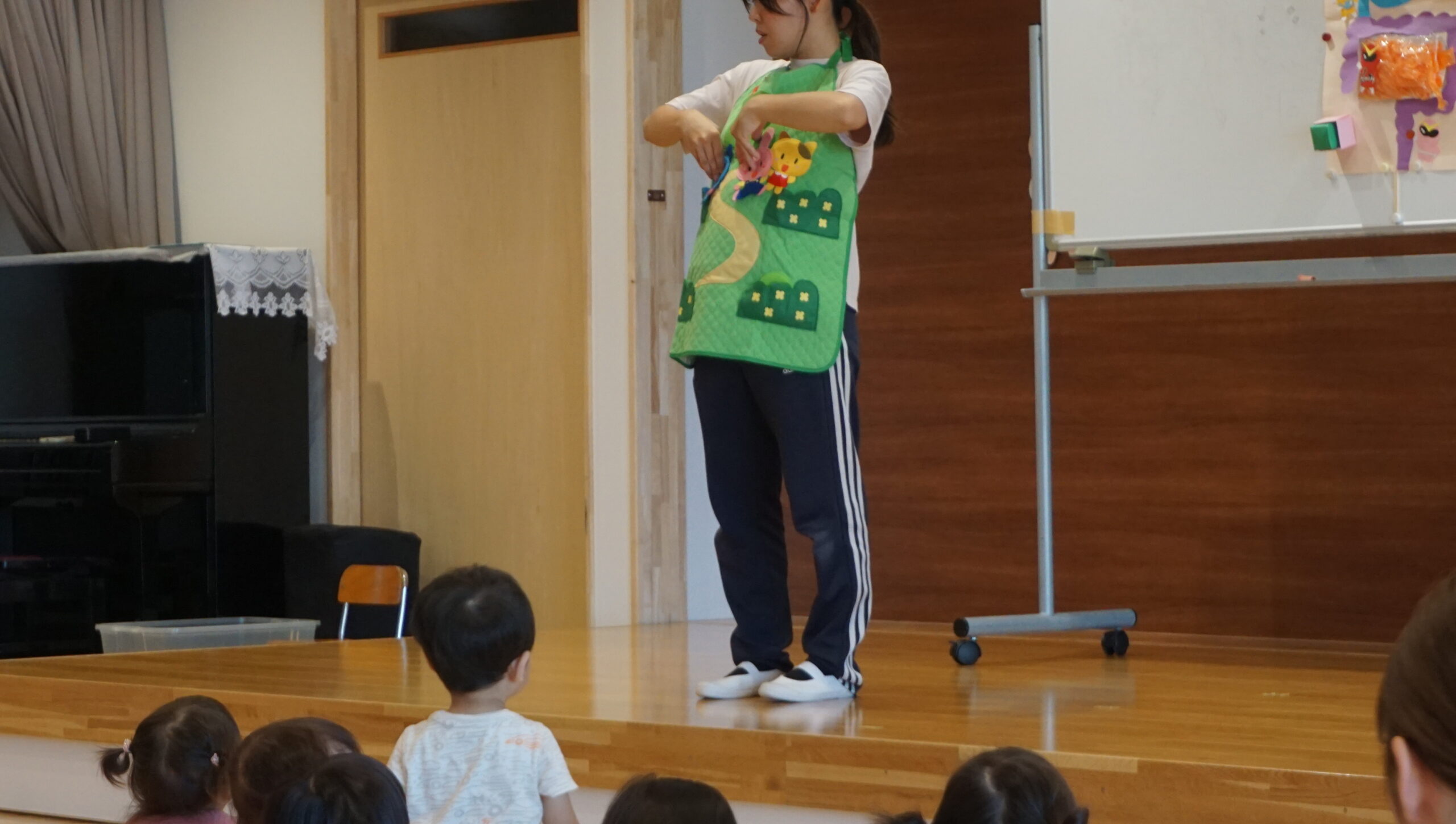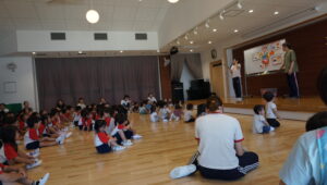 今日の食育会は、朝ごはんの大切さです。朝ごはんも食べず、夜遅くまでゲームをしていたカメさんは山に登れず・・という内容のエプロンシアターを見ました。その後は脳のヤル気スイッチを押す食べ物は?おなかにいい食べ物は?など乳児さんにもわかりやすく教えてくれました。