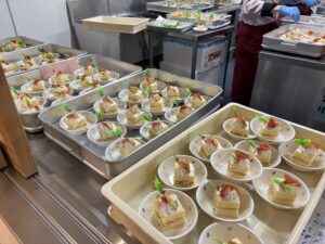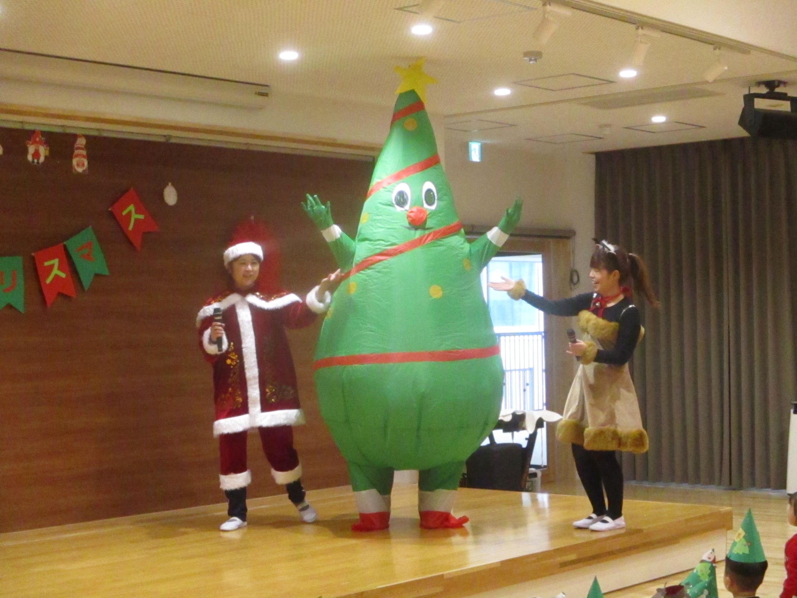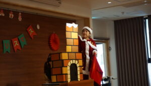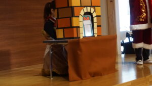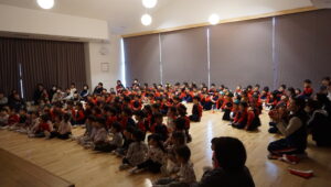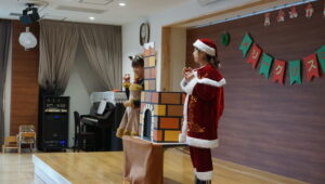 クリスマスパートⅡがありました。サンタクロースやトナカイの衣装の先生が、煙突からクリスマスプレゼントを入れ、みんなで当てあいっこをしました。プレゼントにライトが当たり、浮かび上がるので大喜びで当てていました。ラブブやミャクミャクも出てきて大盛り上がりでした。給食はケチャップライスに唐揚げ、おやつにクリスマスケーキを食べ、楽しいクリスマスでした。